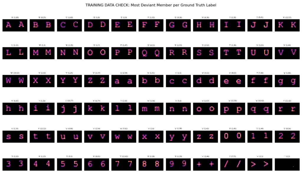 A debug view I added to the training script after I mistyped a character one time too many. It displays the greatest deviation between the average shape of all characters in each training-provided “ground truth” bucket and the max outlier in the same.