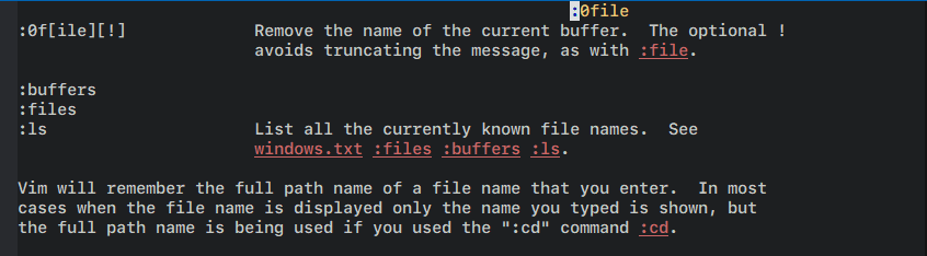 ![:0file :0f[ile][!] Remove the name of the current buffer. The optional ! avoids truncating the message, as with :file. :buffers :files :ls List all the currently known file names. See windows.txt :files :buffers :ls.](https://neosmart.net/blog/wp-content/uploads/2026/01/vim-help-0f.webp)