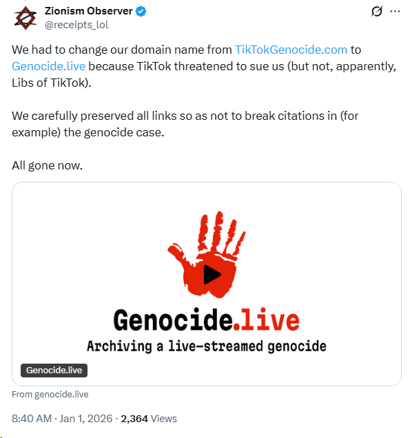 The archive had already come into the legal spotlight earlier last year, when it was forced to change from its original name of TikTokGenocide to Genocide.live after cease-and-desist requests from the new owners of the popular social media platform targeted its use of the domain name, despite its arguably fair-use claim to the name.1