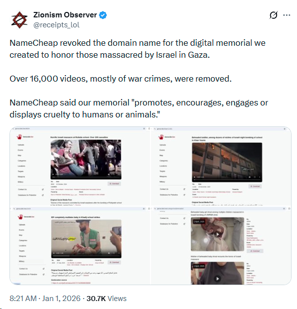 Namecheap.com, the popular domain name and webhosting platform, has taken over the Genocide.live domain name, which was home to a publicly accessible archive of over 16,000 videos documenting alleged Israeli war crimes, the vast majority of which were recorded since the onset of the war on Gaza in late 2023. The archive, formerly known as TikTokGenocide, was previously submitted as “evidence on the State of Israel’s acts of genocide against the Palestinians in Gaza” by the South African UN delegation to the United Nations Security Council in February of 2025 and is also included in ongoing court proceedings of the International Court of Justice case South Africa (et. al.) v. Israel.