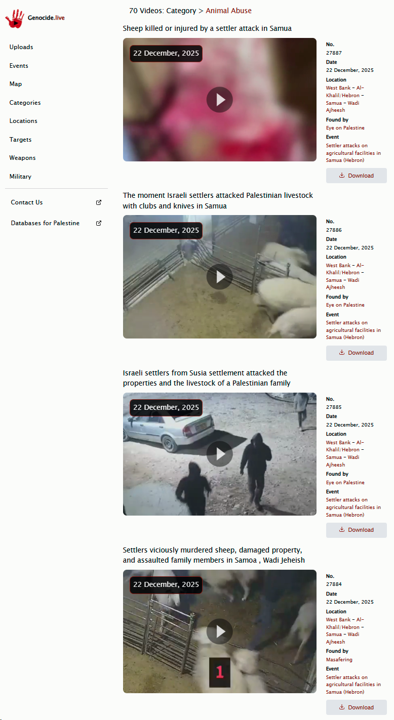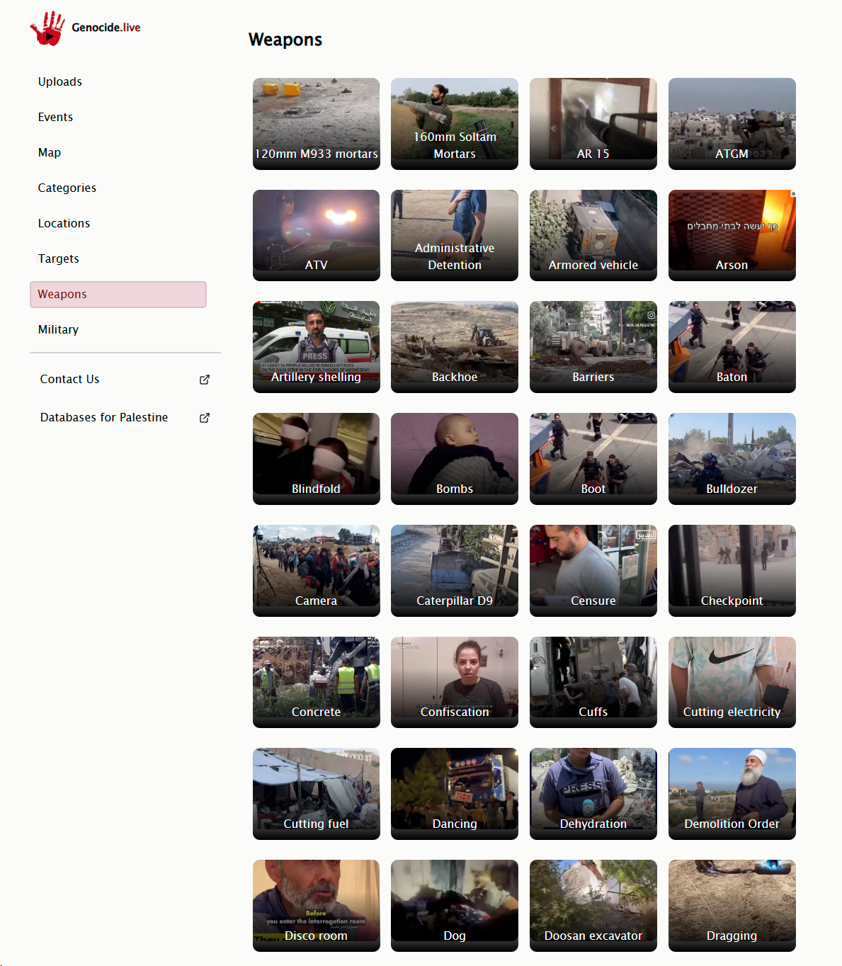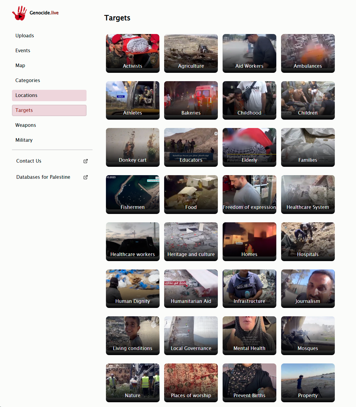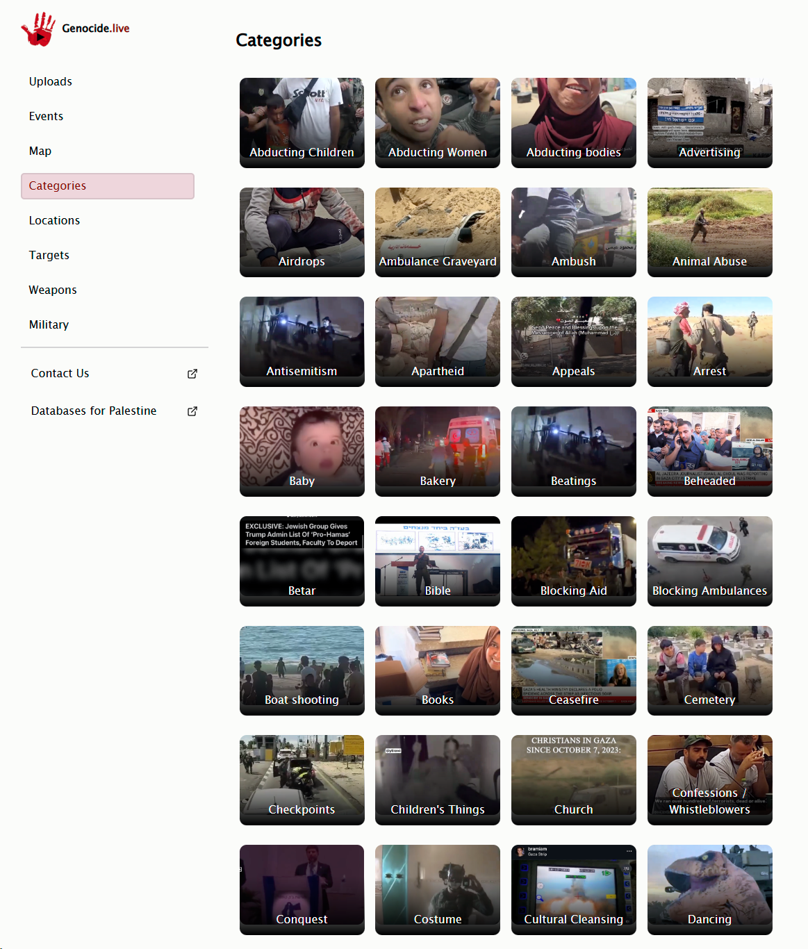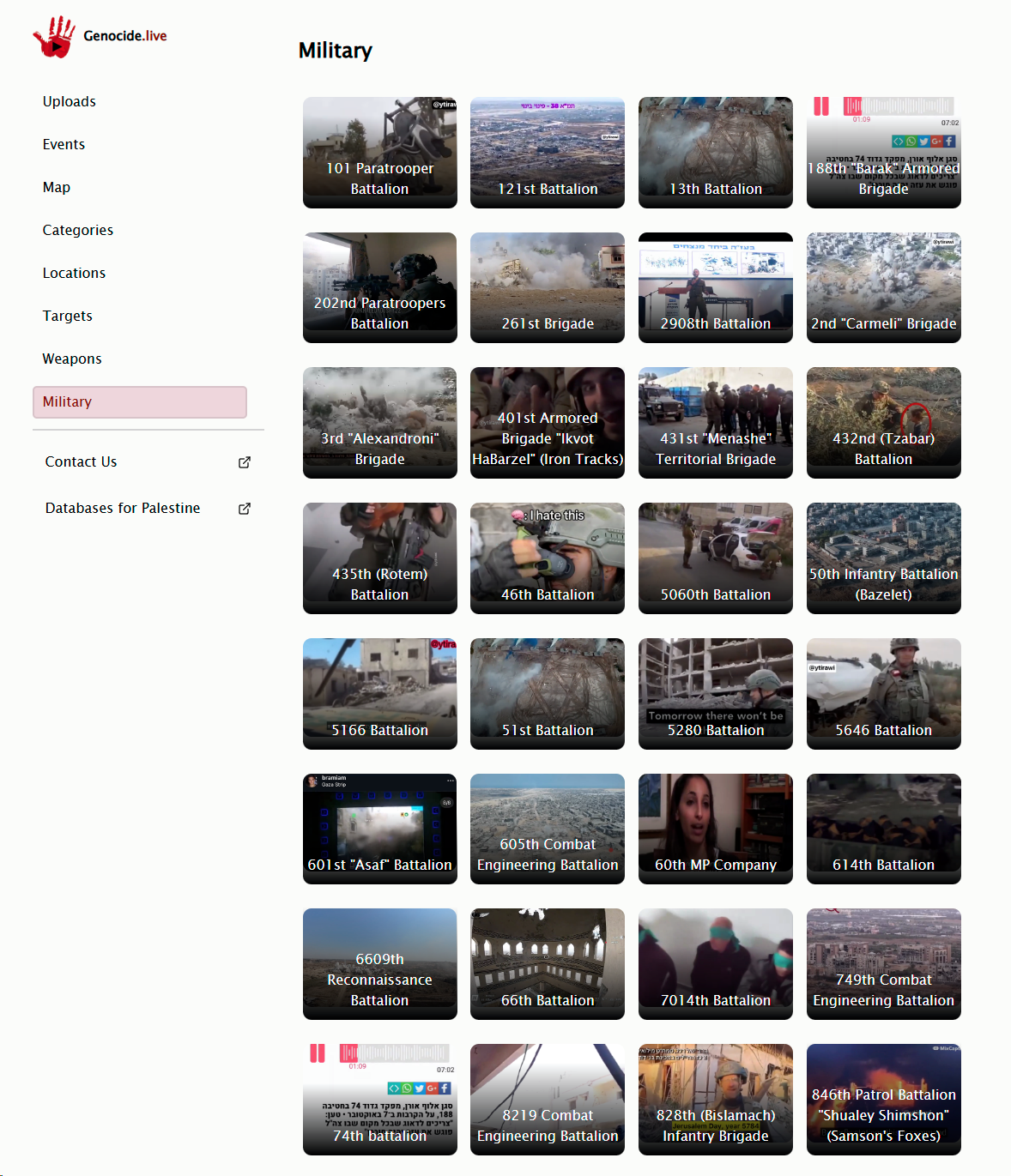 In addition to hosting over 16,000 videos of evidence documenting evidence of war crimes by Israeli soldiers and examples of intent of genocide from Israeli military and civil leaders, the Genocide.live archive also included an interactive map of Gaza detailing IDF violations against the populace in each area, a geolocated index of the videos for which location data was positively determined, a categorized listing of videos detailing the nature of violations, an extensive index of the different types of victims of Israeli agression, a cross-indexed reference of various weapons of war used, and, perhaps most sensitively of all, a cross-indexed list of individual IDF brigades and battalions tied to each of the hosted pieces of evidence, where that information was available.