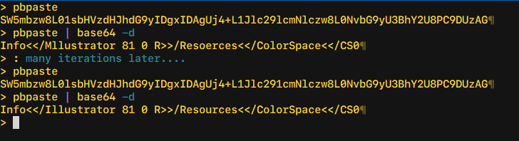 > pbpaste SW5mbzw8L01sbHVzdHJhdG9yIDgxIDAgUj4+L1Jlc29lcmNlczw8L0NvbG9yU3BhY2U8PC9DUzAG > pbpaste | base64 -d Info<</Mllustrator 81 0 R>>/Resoerces<</ColorSpace<</CS0 > > # which I was able to correct: > > pbpaste SW5mbzw8L0lsbHVzdHJhdG9yIDgxIDAgUj4+L1Jlc291cmNlczw8L0NvbG9yU3BhY2U8PC9DUzAG > pbpaste | base64 -d Info<</Illustrator 81 0 R>>/Resources<</ColorSpace<</CS0