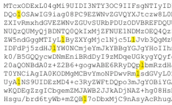 You can ignore the EFTA00400459 on the second line, that (or some variant thereof) will be interspersed into the base64 text since it’s stamped at the bottom of every page to identify the piece of evidence it came from. But what else do you notice? Here’s a hint: this is what proper base64 looks like: